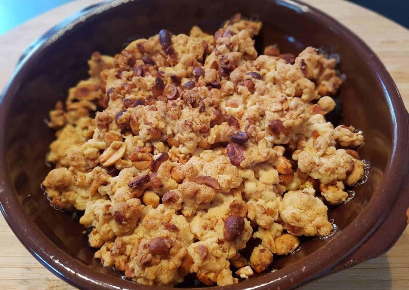 - Préparer le crumble en travaillant la farine avec le beurre coupé en dès, les cacahuètes grossièrement concassées et le parmesan.