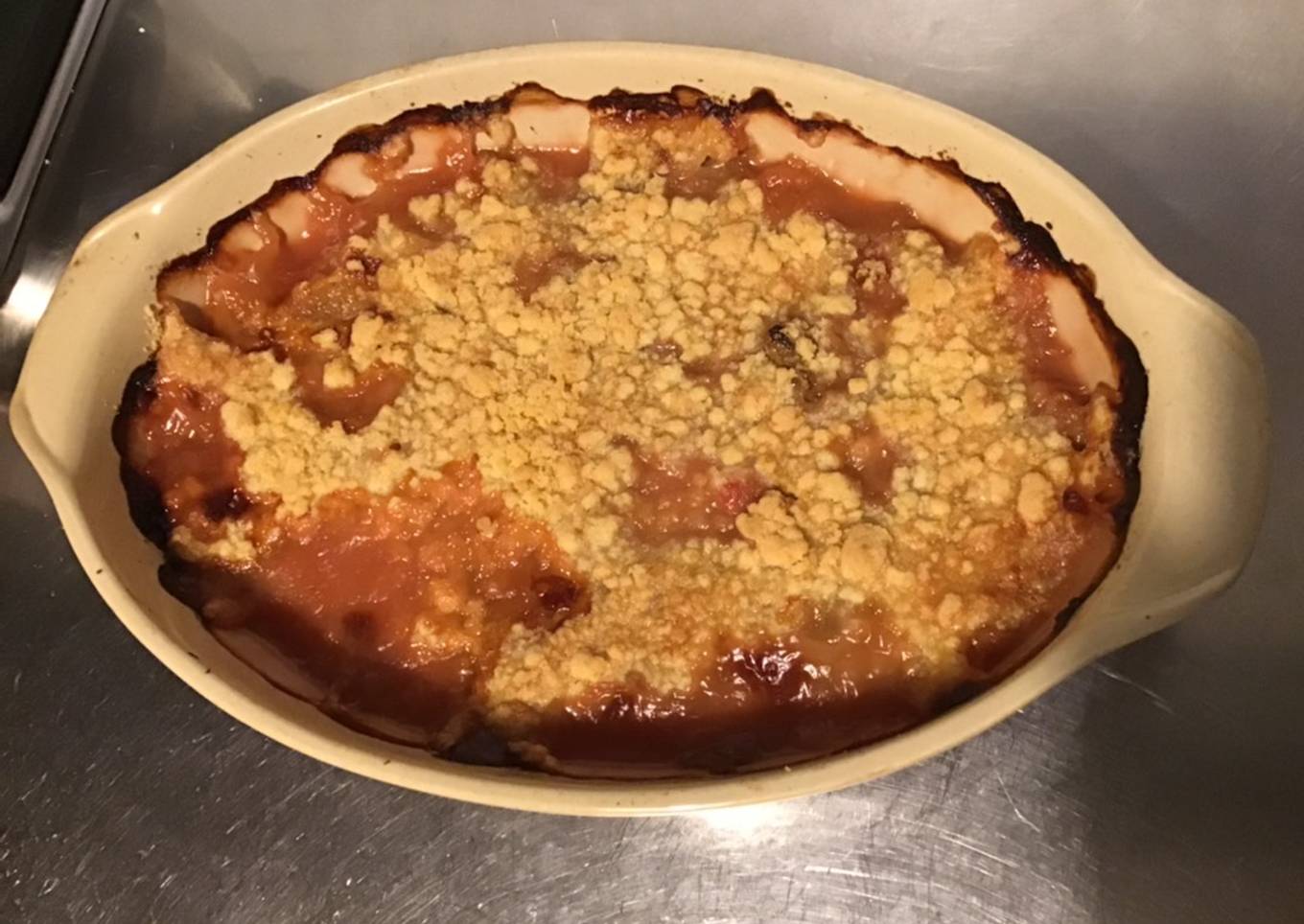 - Couvrir la compote avec la pâte à crumble enfourner pour 20 minutes puis monter le thermostat à 200 degrés poursuivre la cuisson 10 minutes