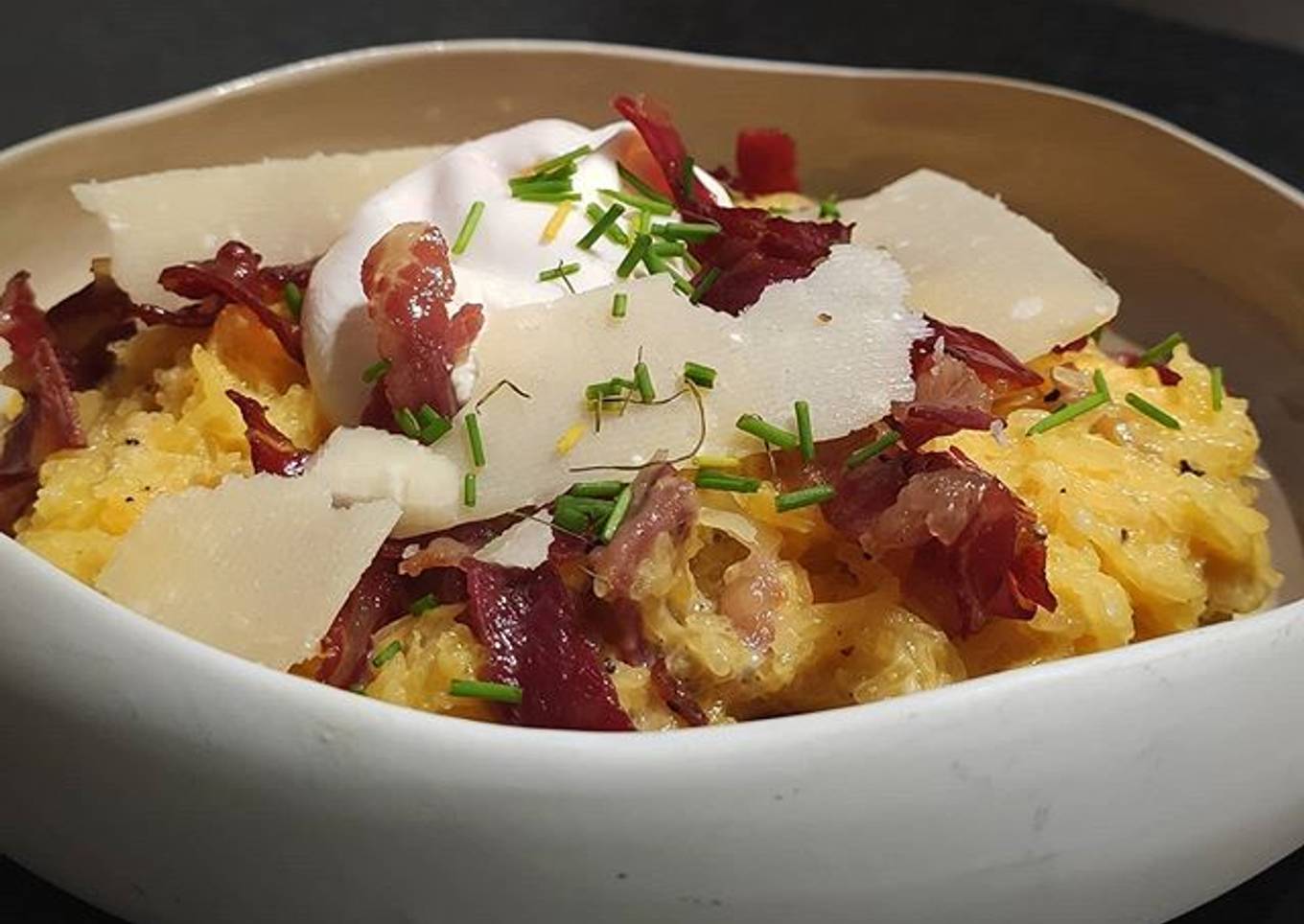 Courge spaghetti, crème de parmesan, coppa grillé et œuf poché