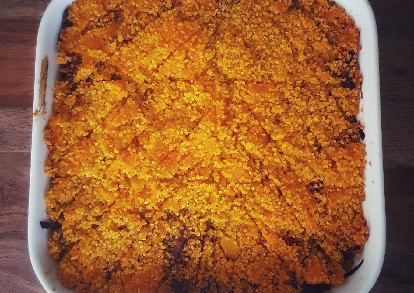 - Pour le montage, mettre huile d'olive dans le fond du plat. Ajoutez la moitié du mélange boulghour potiron. Puis ajoutez toute la farce. Enfin la dernière couche de boulghour. Faites des dessins avec votre couteau.