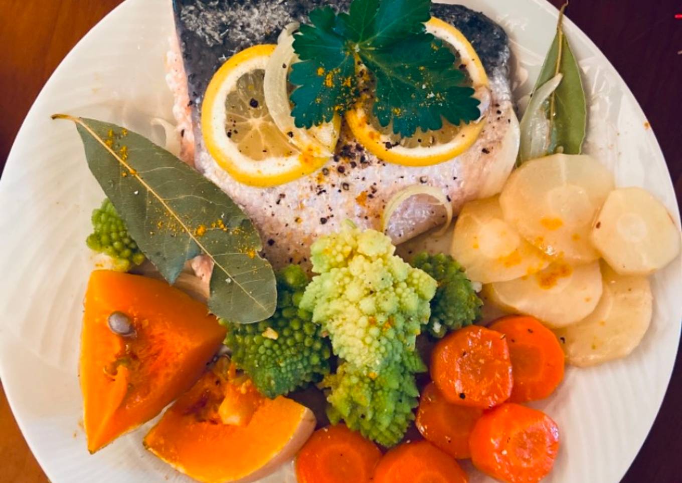 - Dressez les pavés de saumon avec les légumes dans une assiette saupoudrez de curcuma en poudre et de fleur de sel