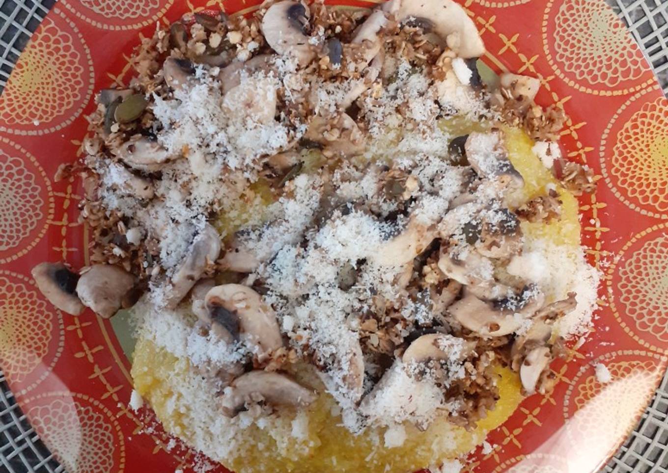 Dresser la polenta dans une assiette avec la poêlée de champignons et saupoudrer le tout de parmesan.